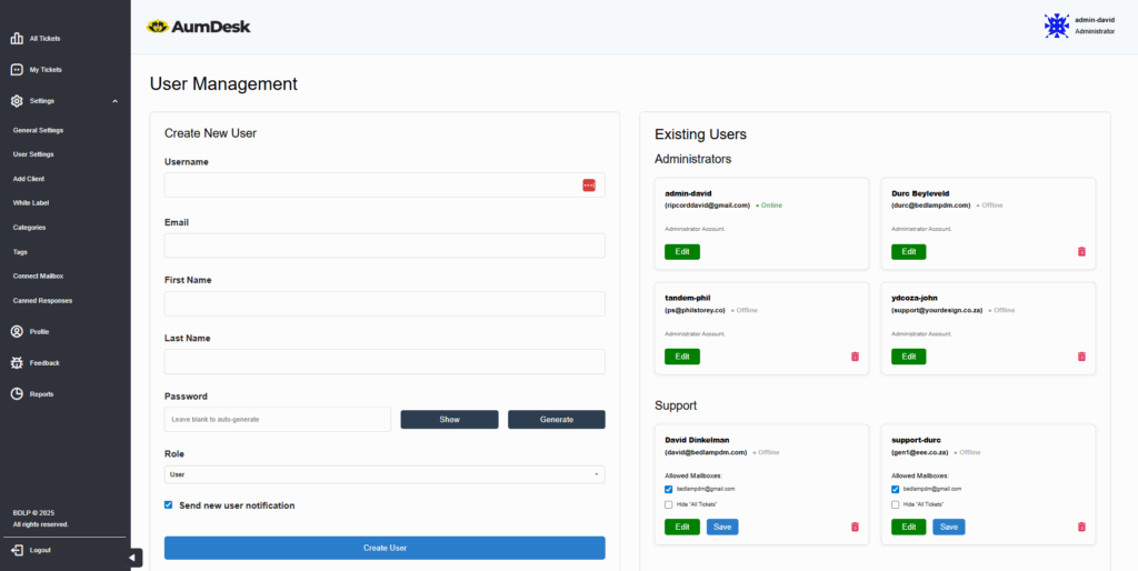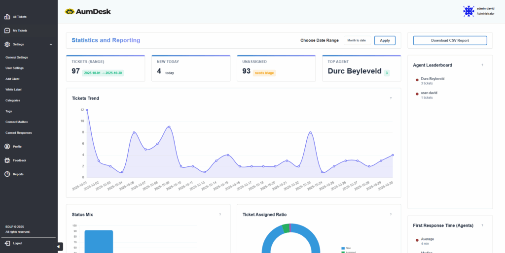 Get clear visibility into team activity with live analytics and exportable reports. See which users are closing the most tickets, where bottlenecks occur, and how much time is being spent per client — all visualized through clean, actionable dashboards.